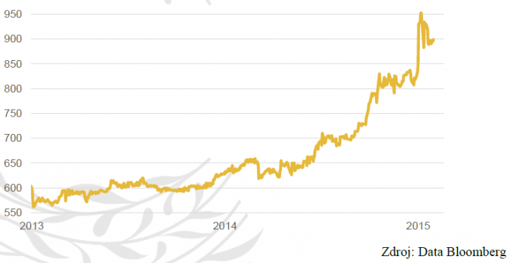Graf: Vývoj ceny akcií společnosti Pegas Nonwovens v posledních dvou letech (CZK)